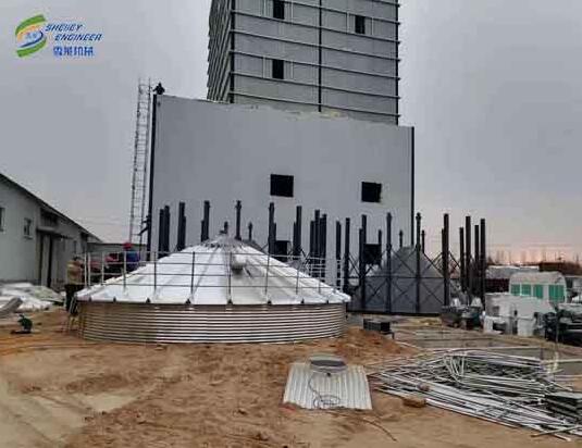 內(nèi)蒙古包頭飼料廠2臺500T全鋼錐底鋼板倉正在安裝